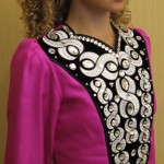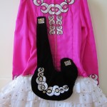 Sparkling Gavin dress of pink satin with detailing of black velvet and white embroidery. Lovely crystal work along the front and at sleeves. White tiered skirt. Excellent condition. 1″ to let out at each side seam, 1″ at the back zipper. Comes with white bloomers.
