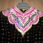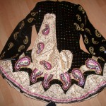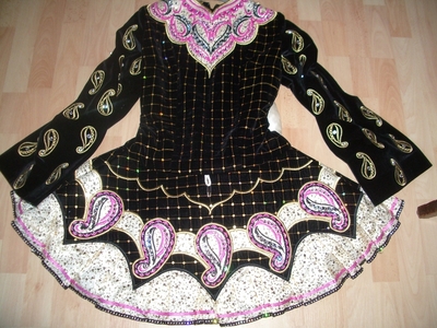 This is a beautiful dress made of sequinned black velvet and pale gold satin, with embroidered pink paisley design on skirt and shawl, pink and black embroidery around neck, deep gold frill at hem, and gold paisley embroidery on sleeves, all covered in more sequins and diamantes. Less than 1 year old. Very clean, (non-smoking household).
