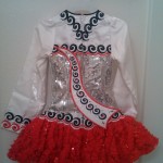 Dazzling Gavin in bright white satin with silver sequins and red chiffon skirt. The skirt ruched chiffon and is accented with red sequins. The bodice is accented with red, black, AB, and clear Swarovski crystals. Dress was featured by Feishonista as a trend setting dress. Dress is stunning but dancer has outgrown due to growth spurt. It is less than 6 months old and in excellent condition. Dress comes with matching headband and bloomers.