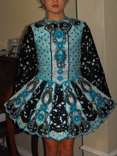 Beautiful, blue and black sparkly dress, looks fabulous on stage. The dress is a two piece, bodice attaches to skirt with sturdy snaps. Cape is soft and flowing. Sale includes custom made headband by Celtic Creations, bloomers and blue shoe buckles.