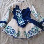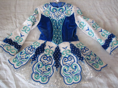 Siopa Rince Solo Dress. Royal Blue Velvet Four Panel with silver sequin petticoat and rhinestone accents. Suitable for a 9-12 year old Prelim or Open dancer. Includes Bloomers and Headband. Stored flat in dress bag. Excellent condition. Additional pictures available upon request.