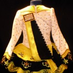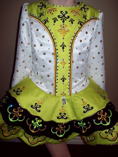 Sparkles on stage! Only 7 months old, this dress was created by Kerry Houston TCRG of Draiocht Designs. This cute little white, gold and citrus lime/yellow dress would be ideal for an 8-9 year old. The fabrics are white satin with gold glitter overlay, citrus satin and glitter dot sequin lining. There is also a white tulle tutu attached to the lining. The dress has ties inside the back of the dress for any adjustments needed in the waist. This little dress is adorned with hundreds of Swarovski crystals and truly sparkles on stage!