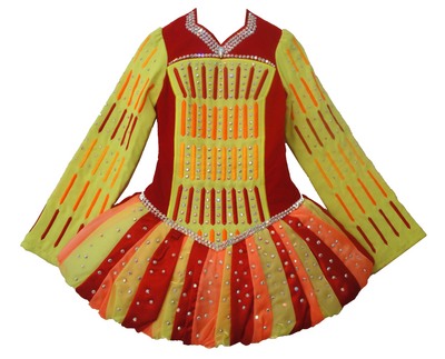 Championship winning Gavin Doherty dress approx 8 months old. Red velvet bodice with yellow sleeves and bodice panel. Satin new style Gavin skirt in red,orange and yellow. Yellow lining and a shawl to match the skirt. The dress has over 1000 large Swarovski crystals in the design and is very eye catching with amazing stage presence. Dress comes with matching kick pants and hairband.