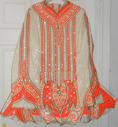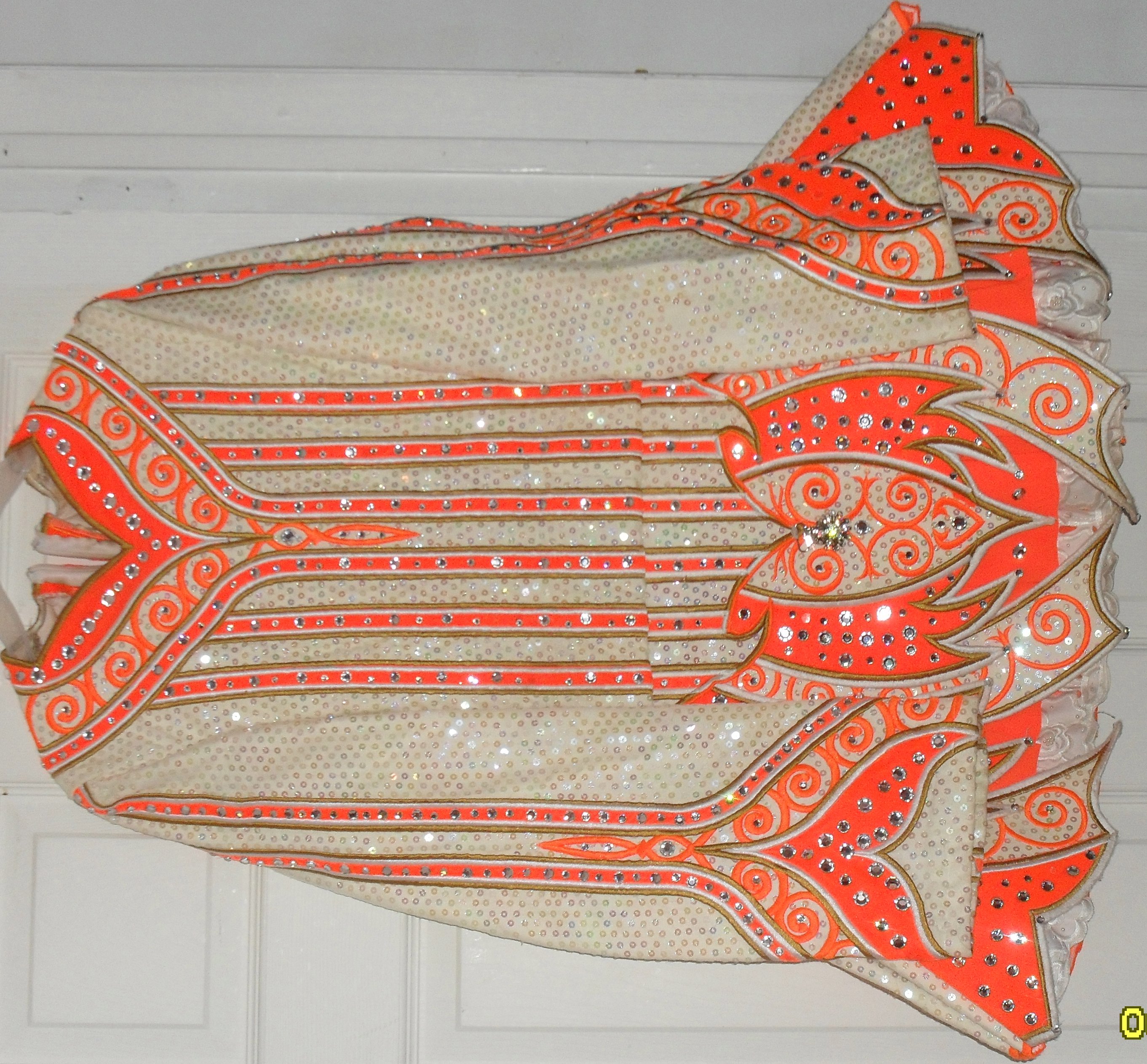 Three year old cream and neon orange Gavin Doherty dress for sale. Includes bloomers and headband. Comes from a smoke free home. In great condition with hundreds of diamonds. Neon orange looks excellent under bright lights and on stage.