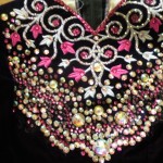 Purple velvet which shades different in different lights, has beautiful fushia embroidery and has approx 9 gross of Swarovski crystals added, comes with double tiara, bloomers and 613 Morgan II wig if needed.