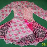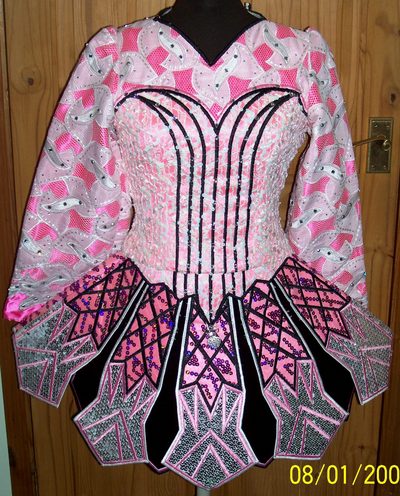 Dress is Baby pink, bubblegum/fushia pink and black with silver sequin fabric appliqued on panels, white overlay on sleeves with clear swarovski crystals, black velvet underpanels and pink and white check underneath, dress comes with removable dress shields which can be washed, leaving no smelly odours. The dress is in excellent condition
