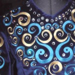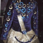 Beautiful royal blue velvet dress with gold and light blue embroidery with nearly 200 Swarovski clear crystals. The skirt is double-pleated metallic. Includes bloomers, headband and cape.