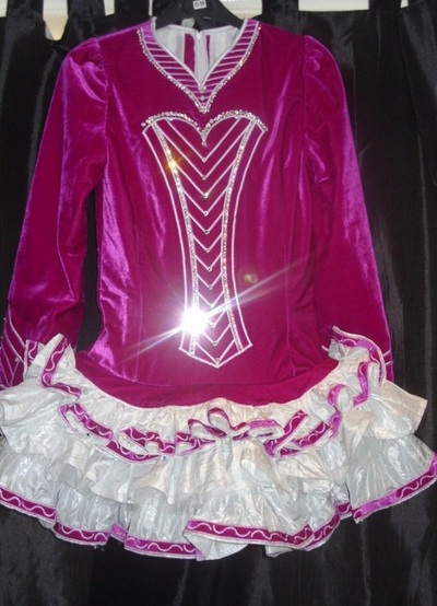 Bright pink velvet with white embroidery and a white ra ra skirt with pink velvet trim. very light and easy to dance in.