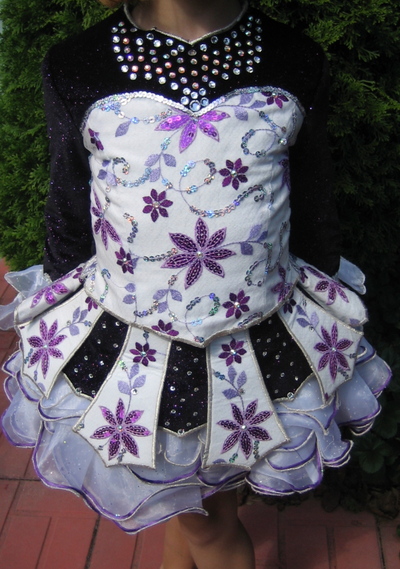 Dress is a 3 piece (jacket, skirt with under-bodice, and cupcake skirt) and is in very good condition. Dress is smoke free. This dress was created with a growing dancer in mind and has the ability to change length quite easily. All fabrics were chosen to accept alterations well. The dress is constructed of a dark purple sparkle velvet on the bodice, skirt, and cape. The white section is made with a lovely overlay imported for the dress from Hong Kong. The overlay is embroidery accented with sequins. The cupcake is separate from the dress in order to provide as much flexibility in length as possible and is on an elastic waist. The cupcake is a white organza with crystals throughout. Cupcake is 5 very fluffy layers, each edged with fishing line encased in silver thread. The bottom 4 layers have purple piping attached to add detail to the cupcake. The skirt is a 4 panel look and is attached to an under bodice which allows for the skirt length to be brought up or down more easily than a traditional 1 piece. The jacket currently has two layers of cupcake cuffs in order to add length. Again those are easily removed in order to shorten, and could be added back on later, one layer at a time. The jacket also includes a hidden number holder. The dress has been accented with many Swarovski crystals (clear and AB).