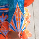 Beautiful Gavin Doherty dress, only 12 months old, that we are very sorry to see go. Bodice is blue holographic sequins with orange and white embroidery, skirt is alternating tiers of blue/aqua colored velvet and orange fishing line ruffles. Hundreds of added Swarovski crystals. Underskirt is a white satin. Dress is in excellent condition, no marks. Comes from non-smoking home, always stored flat. Nylon net sewn on inside of sleeves to protect ruffles from sequin snags. Asking price includes bloomers and headband.