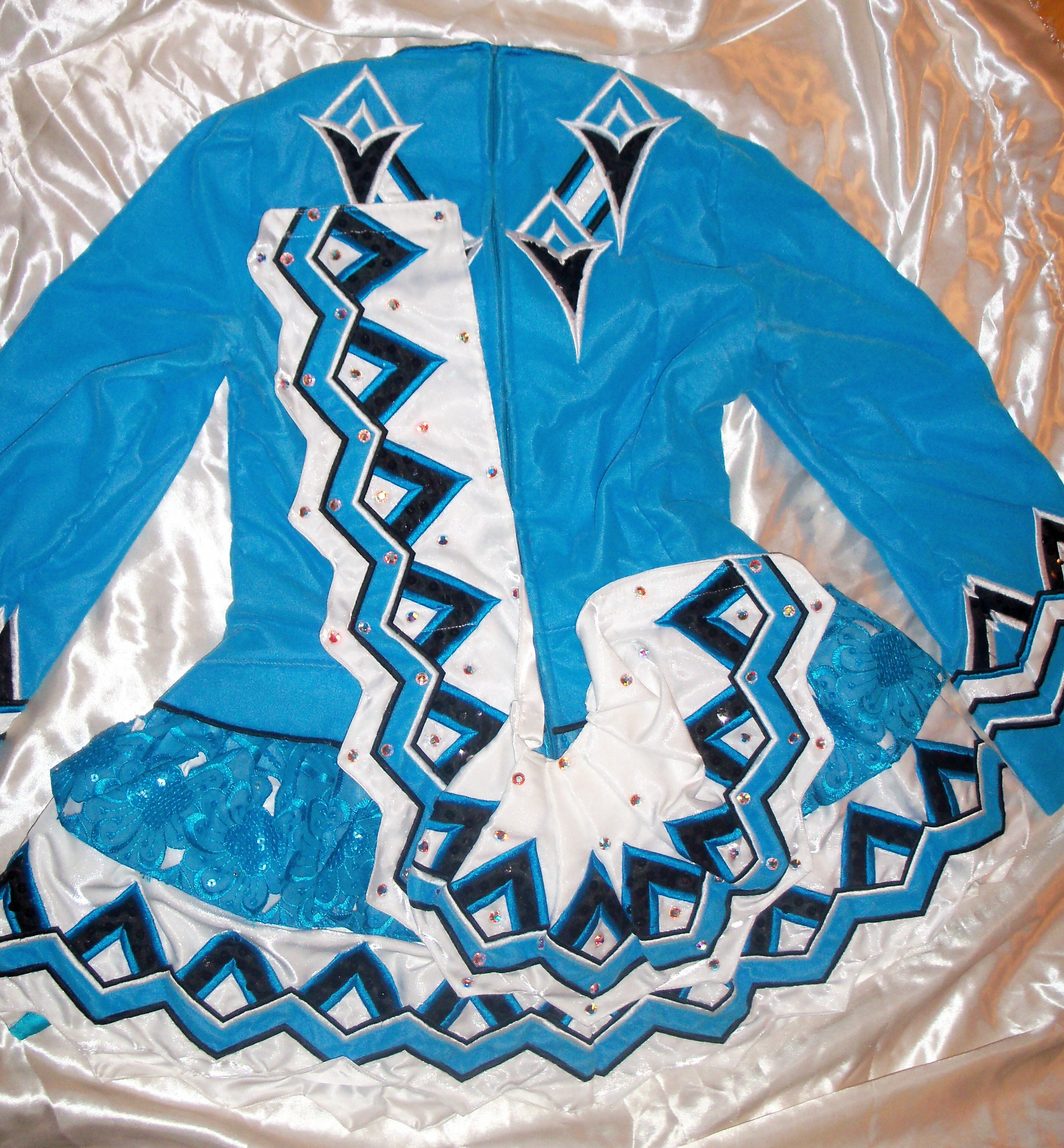 This beautiful Geraldine Taylor dress was made for Midwest Oireachtas 2009 and has only been worn 6 times. It is from a non-smoking home and is odor free. Beautiful sky blue lightweight velvet with stark white & black trim. Has never been altered. Matching crystal studded headband included.