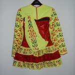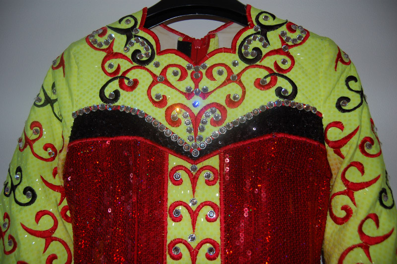 Sparkling Red/Yellow RaRa style drop waisted dress with black design and 100s of diamantes. Very striking on stage. Tiara, pants, diamante socks, leg warmers and Erin wig blonde/brown included in sale.