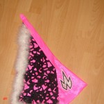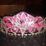 Gently used Pink satin with black lace overlay 3 panel dress. Dress is in excellent condition with no sequens missing, no snags or tears anywhere. The fur trimming on the cape can be removed. Knickers and fabulous matching tiara are included.
