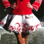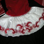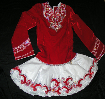 The bodice and sleeves are made in a beautifully bright red velvet and this is offset perfectly by the white skirt. The delightful design on the skirt is enhanced by the addition of hundreds of Swarovski crystals. Crystals have also been added to the design on the bodice ensuring a truly eye-catching sparkle on and off stage. The dress comes with a brooch sewn on to hold the soft lace cape at the back, and a lovely crystal number clip. Red kick pants and red velvet headband, with crystals, included in the sale.