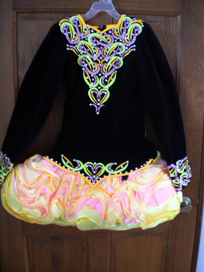Beautiful one year old Shauna Shiels dress for a slim 12-13 year old. We are the original owners and dress is being sold due to dancer out growing it. This black velvet dress is covered in hundreds of Swarovski crystals, along with a multi-colored skirt that has a wonderful stage presence. It comes from a smoke-free home.