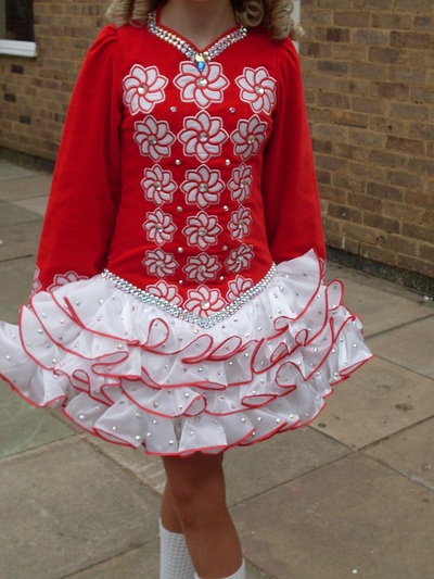 This Beautiful Gavin Doherty dress features a red lightweight velvet bodice and sleeves, with white satin flowers and red embroidery. The skirt is constructed from layers of ruffled white twinkle satin frills, edged with a red trim. The shawl is made of white satin with embroidered red flowers covered in Swarovski crystal . The whole dress is covered in hundreds of Swarovski crystals. The skirt is lined in white satin with matching white bloomers and a red velvet headband covered in Swarovski crystals. This dress has hardly been worn only selling due to growth spirt. Looks stunning on stage. Kept in a smoke free home.