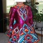 A unique solo dress. Perfect first solo dress for dancer 8-10 years old. Geometric designs on a three-panel skirt include crystals and mirrors that sparkle and shine from the stage. There is no other dress like this one. Beautiful cranberry color with turquoise under-skirt.
