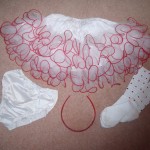 Lovely Sue Breen dress, red velvet bodice with red and white panels. The sleeves are made of white organza covered with red sequins. The underside of the panels and the dress lining is red satin. The dress comes with white satin bloomers, red diamante socks and diamante encrusted red headband. There is also a white with red trim tutu to go under the dress. The dress is encrusted with Swarovski AB crystals which gives extra sparkle and looks stunning on stage. This dress would suit a slim dancer aged 6-8 years and would be ideal as a first solo dress.