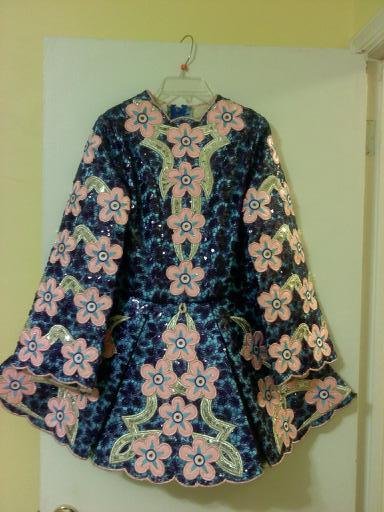 Various bright blues with pink accents and rhinestones (some missing). Great dress for new dancer or new soloist. Bloomers included. Shipping included in price of $375.