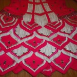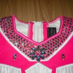 Bright pink dress with design in pure white pleated satin. The dress is enhanced with hundreds of swarovski crystals (in different sizes – the larger ones being hand sown). The neckline is created with crystalised necklace.
