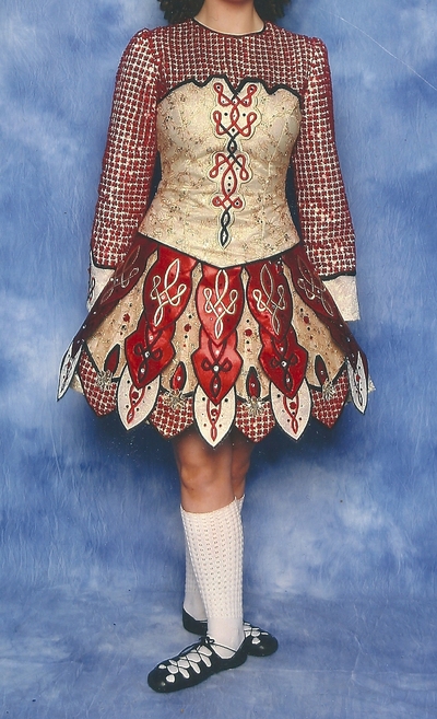 This magnificent red and gold dress was designed for my daughter by Kilkenny Irish Dance Costumes. It is a much loved and often admired unique dress that has sadly been outgrown too quickly. The bodice is made from sequined gold overlay on a cream embroidered