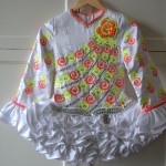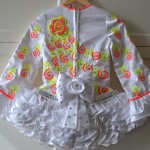 Made in September 2010 and has been worn approximately 6-7 times. It is in good-excellent condition. Dress is made of white twinkle satin with pink and coral embroidery. Included in the sale is one pair of yellow kick pants. Underneath of dress is also yellow.