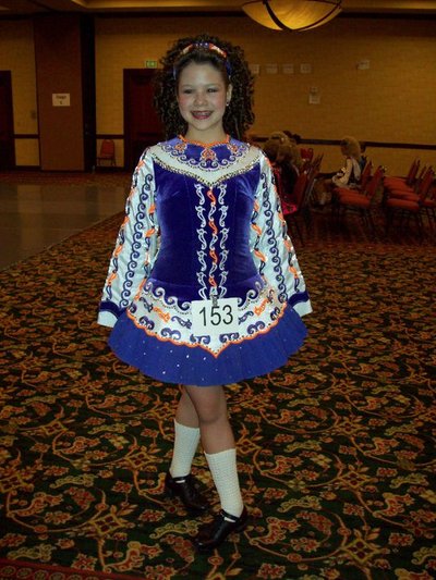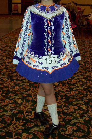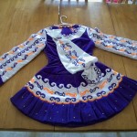Beautiful purple velvet and white satin Siopa Rince made in 2009. Embroidery is purple, white, and bright orange, and it is covered in 100s of crystals, really making the dancer stand out on stage. My prelim champ daughter loves this dress but outgrew it (it fit her best when she was about 5′3-5′4). Measurements given were taken flat, front v to hem is 30″, back full length is 32″.