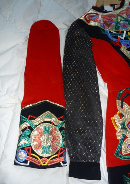 Dark Red and Black Velvet dress with gold design. It has gold lining. It comes with the original red velvet sleeves.