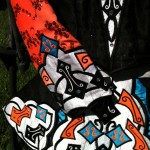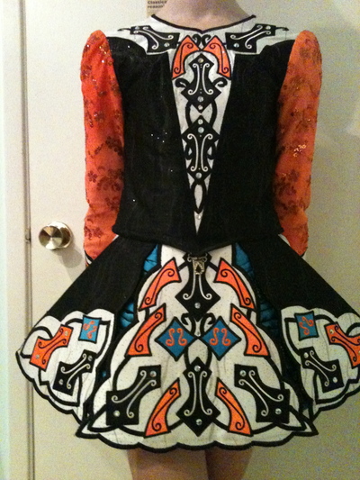 Showy orange & black Dancing in Celtic dress. Perfect 1st solo or 1st Oireachtas dress. Very pretty underskirt matches bloomers, included & headband. Dancer loved dress but outgrew. Photo doesn’t show the tiny, silver, sparkly speckles on white & black fabric too well but can be see in sleeve picture. 3 panel skirt with turquoise accents. Can send more pix of dress, back & sash. Accented with Swarovsky crystals. Black & bling card holder.