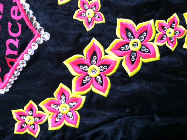 Off The Rack dress Made by Kerin of Jean Olsson Designs bodice is made of Black twinkle satin with sheer black overlay with some sequins bright pink and yellow flower design and swarovki crystals – skirt is made of sparkle encrusted fabric and under skirt kicks up with bright pink and yellow to match the flower design. design is bright pink and yellow flowers dress comes with bloomers, headband, detachable flower (for use with bum wigs) shall, and matching Irish dancer Hanger e mail for more photos. Measurements taken with dress lying flat.
