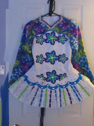 The dress is a gorgeous mix of purple, green & blue on a white dress. There are over 300 AB crystals on the front & back of dress.