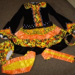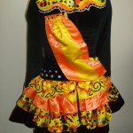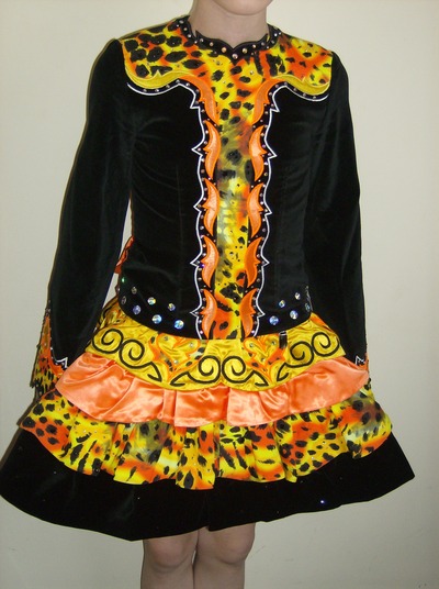 The colours on the dress consist of black velvet, orange, gold satin & snow leopard print Lycra and Swarovski crystals