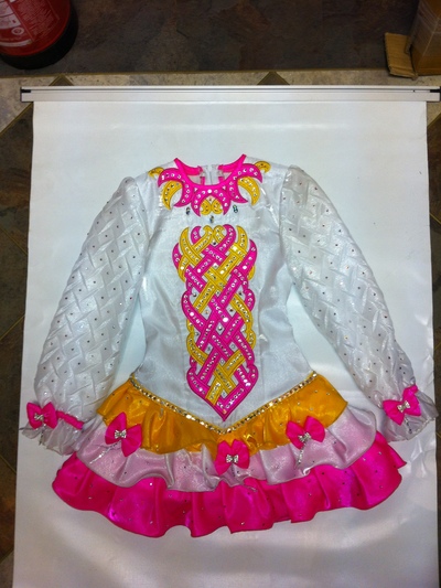 Stunning dress, 1 year old. White twinkle satin embroidered with pink and orange, skirt 3 layers – pink, white and orange Bow details on sleeves and skirt covered in swarovski crystals. Very sparkly and striking on stage. Excellent condition.
