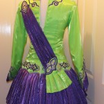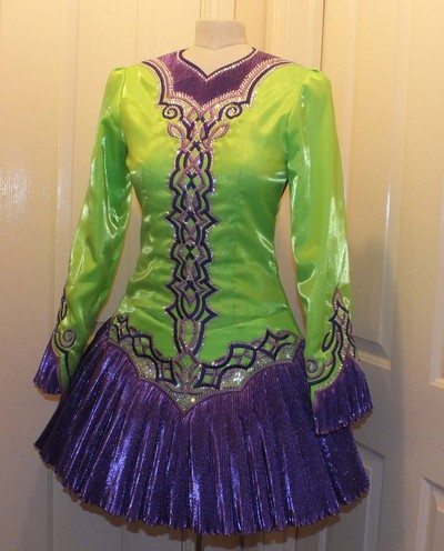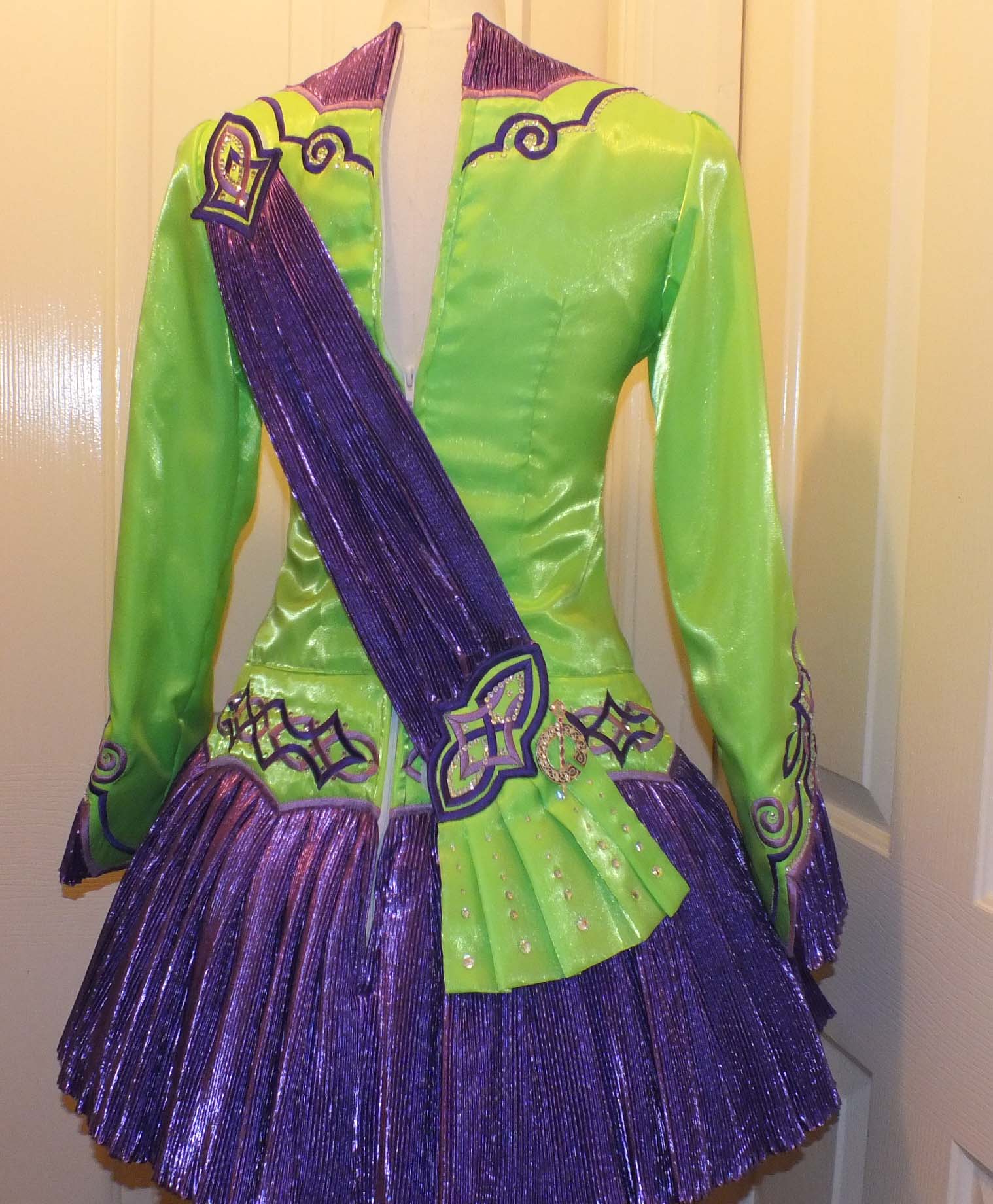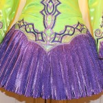 Green satin with both a lighter and darker shade of purple applique (celtic design) and purple crimped, shiny material for skirt and cuffs. Under skirt consists of Green and White Netted layers. Cloak also made up of purple crimped, shiny material with touch of green, forming pleats at bottom.