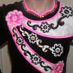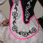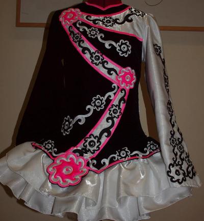 Brand NEW championship dress collected October 2011 , never worn due to dancer no longer needing a dress. Stunning black, white and pink. Comes with lovely shawl and headband. kick pants included. Many hundreds of AB crystals added to dress since photo taken