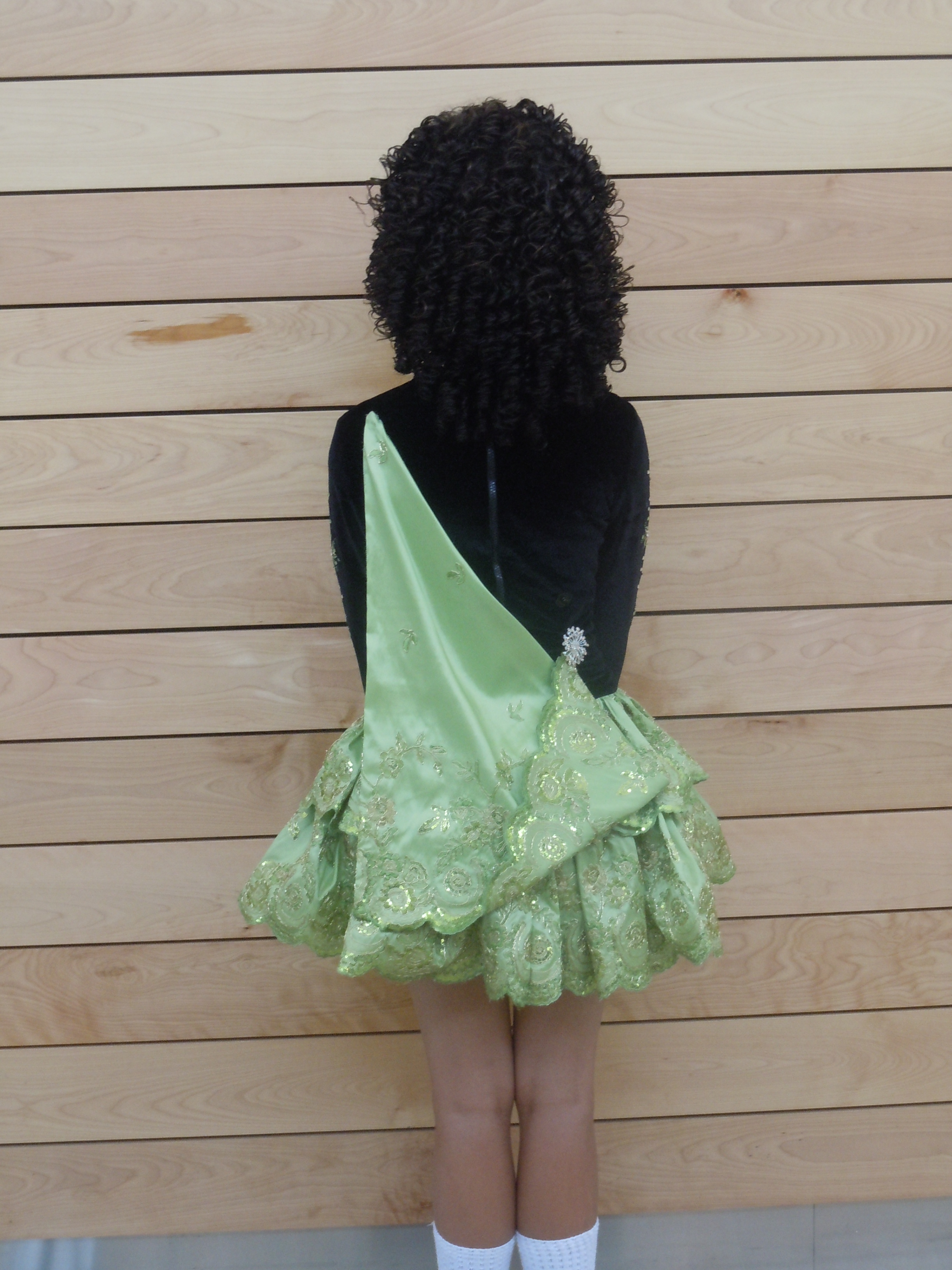 Elegant and unique Emerald Key dress made in 2009. Would fit a dancer between 5’1 and 5’4 best. The bodice is made of black stretch velvet, green fabric with gold details and gorgeous embroidered stars that really make the dress! Up to date soft skirt is 2 layers of green fabric that can be lengthened or shortened, very lightweight and easy to dance in. Photos do not do the intricate details of the fabric justice! The back has a matching soft cape of green fabric. Green, black and AB rhinestones are distributed throughout. This dress has been stored in a smoke-free home and is in almost brand new condition with no stains or odor. Comes with bundies, green headband, bustle for “poofing” the skirt and brooch for fastening the cape. Additional photos and measurements available upon request.