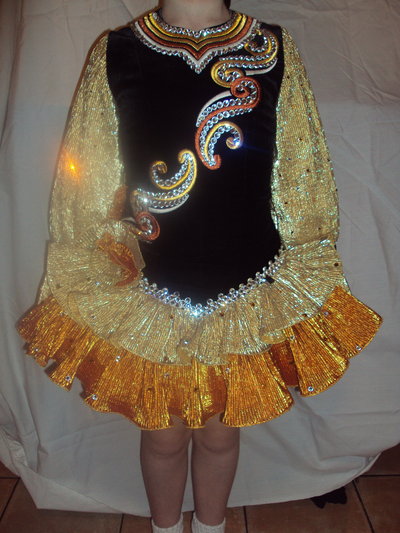 Stunning Siopa Rince dress for sale. This dress has a black bodice with gold sleeves and a gold and rust skirt. This dress has hundreds of crytals on it and had gold crystals on the skirt and sleeves. Its truely stunning on stage and can be seen from the back of any hall due to the sparkle. The dress comes with bloomers to match and also a headpiece that was made specificially to match the dress at Bella Dance.