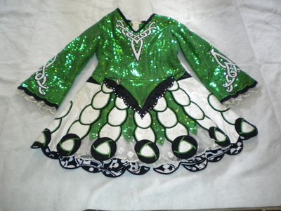 Shamrock green sequined bodice and sleeves with a white panel skirt. The skirt has a white lace mock tutu that is visible from the front only. This dress has beautiful stage presence.