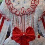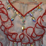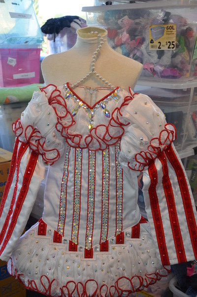 Less than a year old Gorgeous Gavin dress has a few tan marks on the inside you cant see from the outside but I thought I would mention. I have replaced all the missing AB crystals but there are a couple of red ones missing. Made for one of own dancers. Twinkle satin and red velvet stripes. Has hundreds of crystals, I bought it for my daughter but its not suitable as its too short and her teacher wont let her wear it. She is a slight 10 year old so I would say more suited to an 8-9 year old.